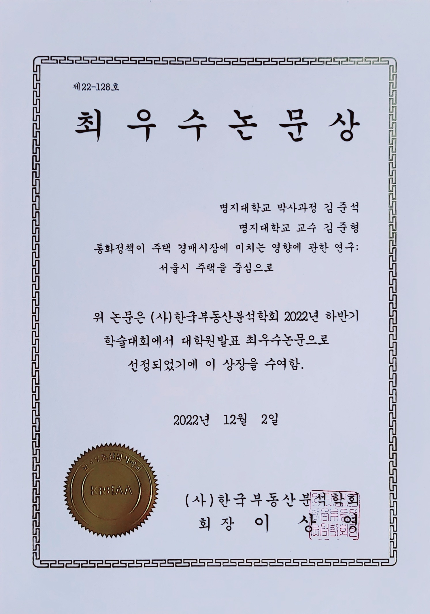 [¼ö»ó] ±èÁؼ®(¹Ú»ç°úÁ¤), Çѱ¹ºÎµ¿»êºÐ¼®ÇÐȸ Çмú´ëȸ ÃÖ¿ì¼ö³í¹®»ó