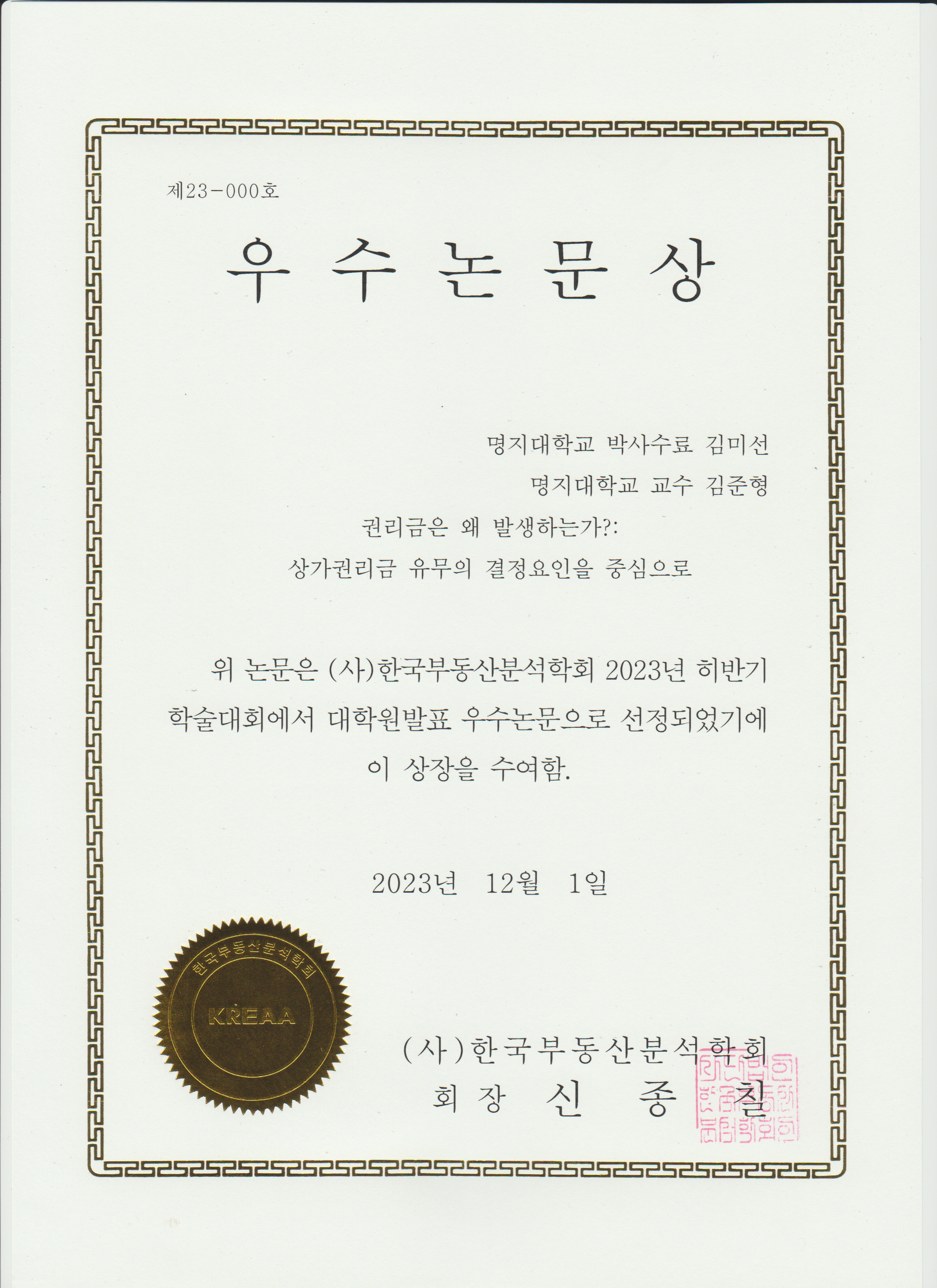 ±è¹Ì¼±(¹Ú»ç¼ö·á) ÇлýÀº 2023³â 12¿ù 1ÀÏ °Ç±¹´ëÇб³¿¡¼ °³ÃÖµÈ Çѱ¹ºÎµ¿»êºÐ¼®ÇÐȸ ÇϹݱâ Çмú´ëȸ¿¡¼ ¿ì¼ö³í¹®»óÀ» ¼ö»óÇÏ¿´½À´Ï´Ù. ÃàÇϵ帳´Ï´Ù.