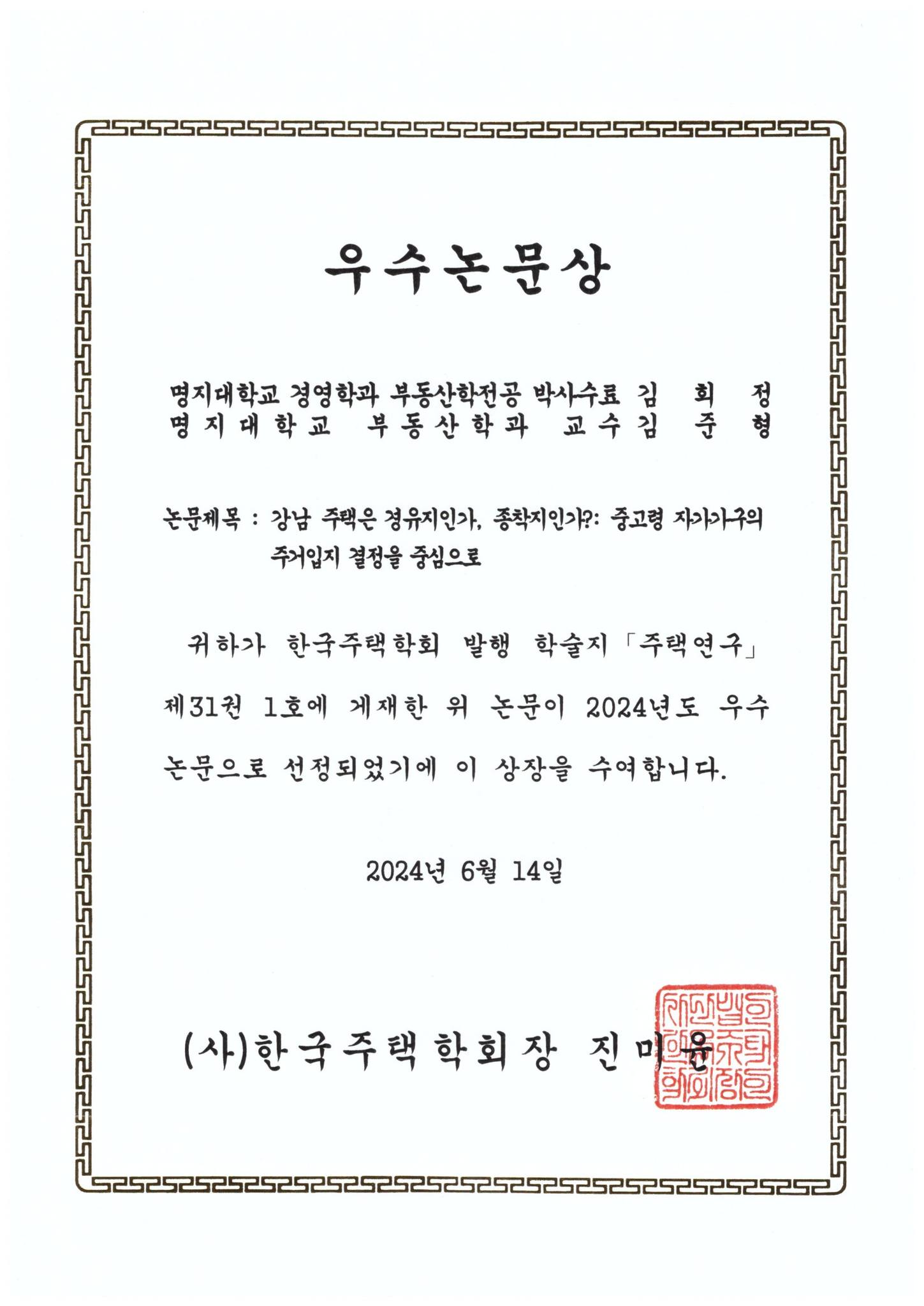 ±èÈñÁ¤ Çлý°ú ±èÁØÇü ±³¼ö°¡ Çѱ¹ÁÖÅÃÇÐȸ ¡¸ÁÖÅÿ¬±¸¡¹Á¦31±Ç Á¦1È£¿¡ °ÔÀçÇÑ "°³² ÁÖÅÃÀº °æÀ¯ÁöÀΰ¡, Á¾ÂøÁöÀΰ¡?: Áß°í·É ÀÚ°¡°¡±¸ÀÇ ÁÖ°ÅÀÔÁö °áÁ¤À» Áß½ÉÀ¸·Î" ³í¹®ÀÌ Çѱ¹ÁÖÅÃÇÐȸ